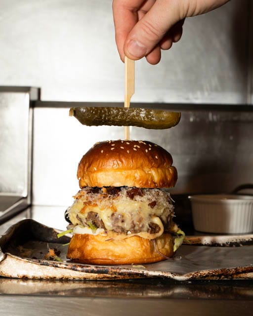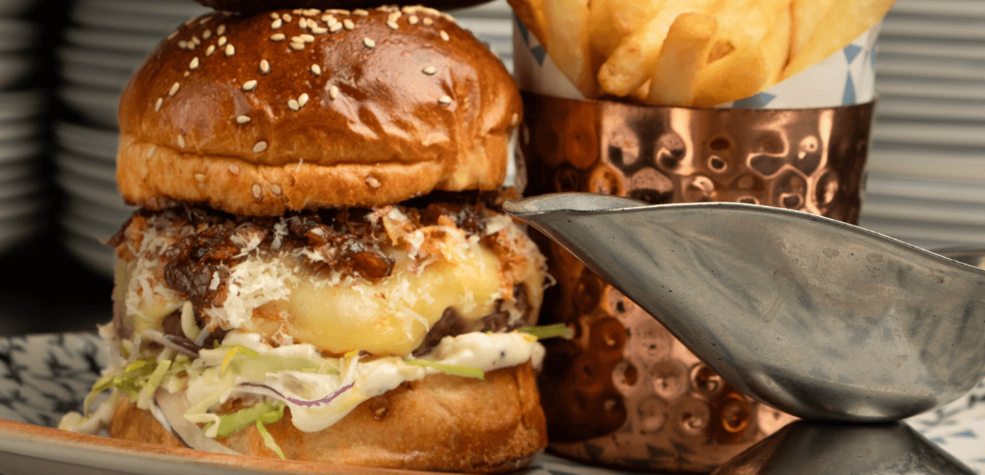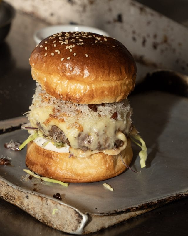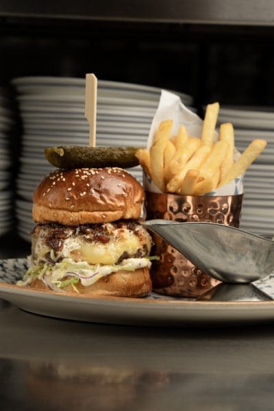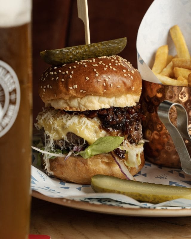 Das Baron Burger; perfectly crafted to satisfy your cravings. Tuck into a juicy 7oz patty made from a rich blend of chuck, short-rib, and smoked beef-fat, complimented by melt-in-your-mouth raclette cheese, bacon jam, crispy shallots and truffle mayo. Served in a soft brioche bun and paired with a rich boat of gravy for ultimate indulgence.