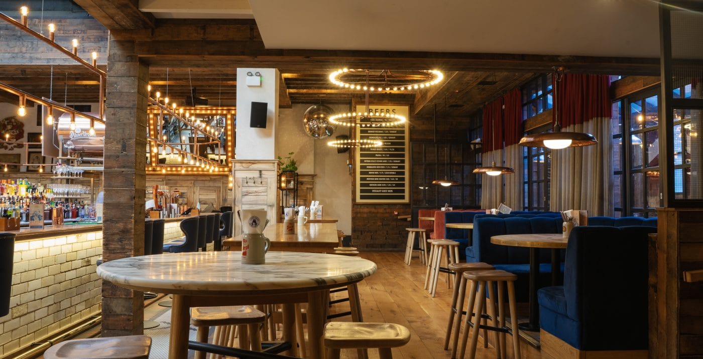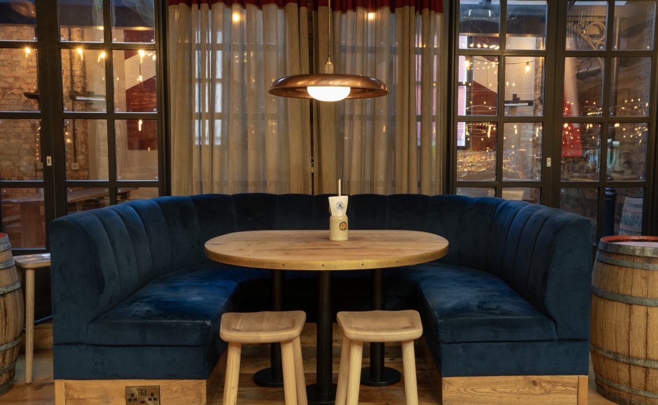Three individual drinks booths for parties of up to 24 guests, with high top tables also available for larger groups of up to 80 guests, giving you the entire back section of our Schloss.